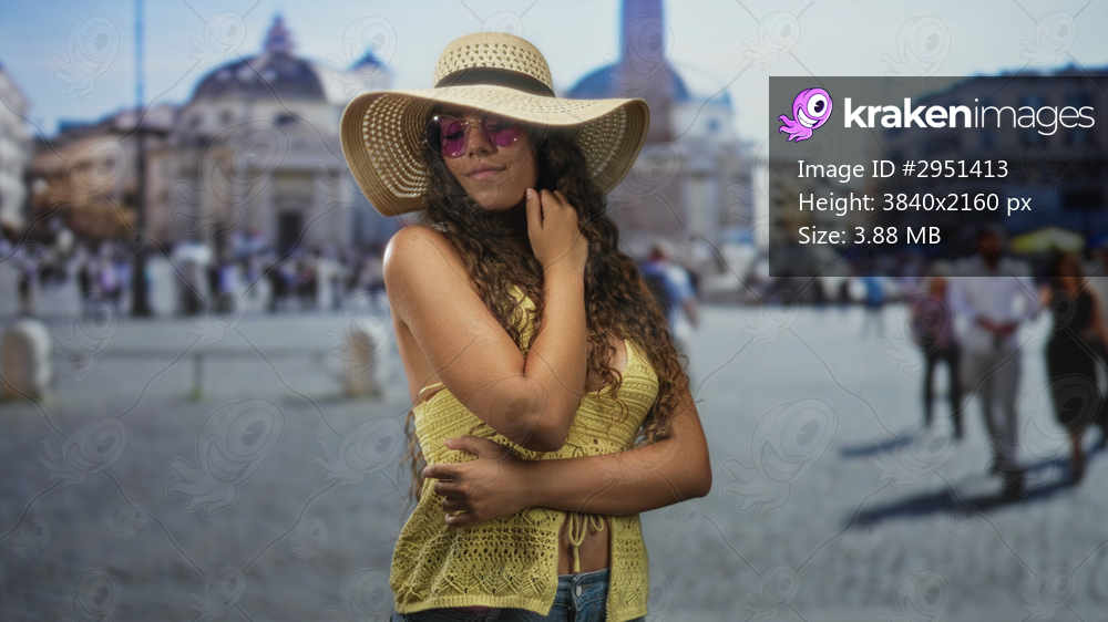 Woman in yellow crochet top wearing wide brim hat and sunglasses posing with hand to chin and arm crossed in street; confidence travel leisure.