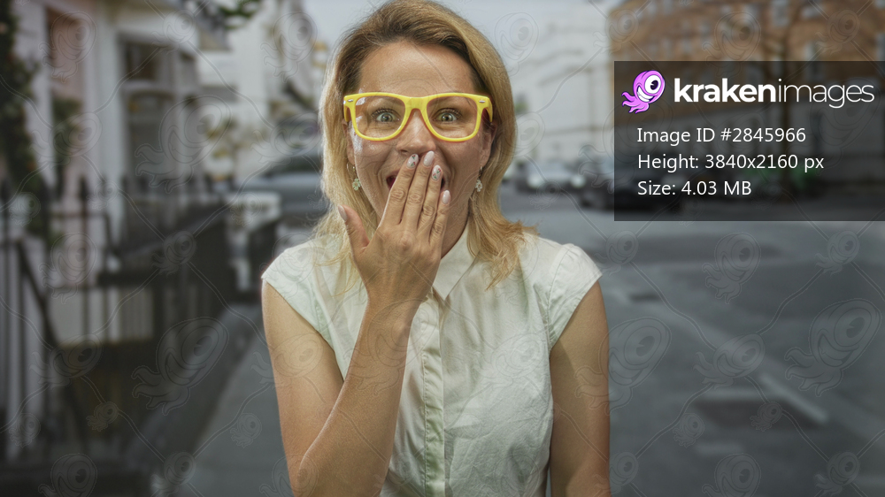 Woman in yellow glasses and white sleeveless top covers mouth with hand while smiling on street; surprise.