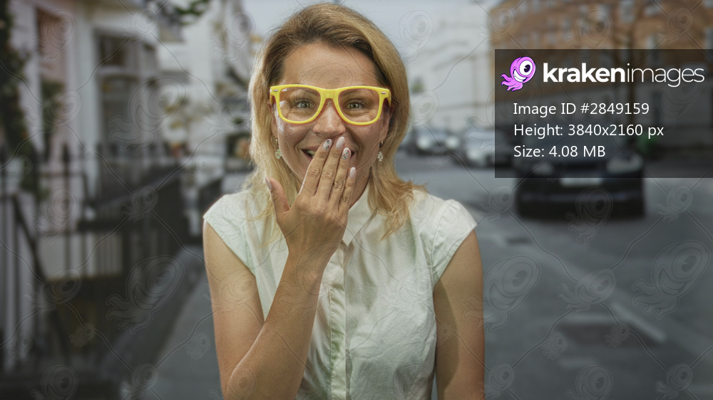 Woman in yellow glasses and white sleeveless top covers mouth with hand while smiling on street; surprise.