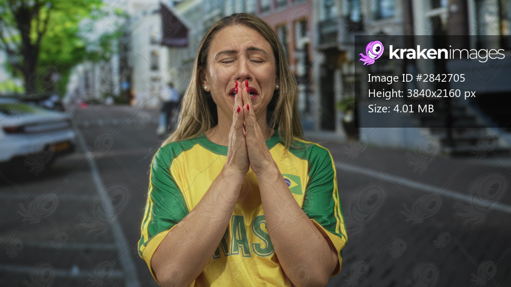 Woman in yellow jersey rubs fists against her eyes on street; sadness disappointment longing reflection.