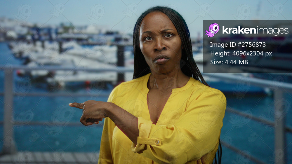 Woman in yellow shirt with braids stands at seaside port with boats visible.