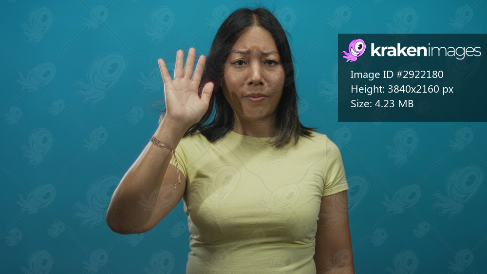 Woman in yellow shirt covering eyes with hand in small studio against teal blue backdrop; shy reflection.