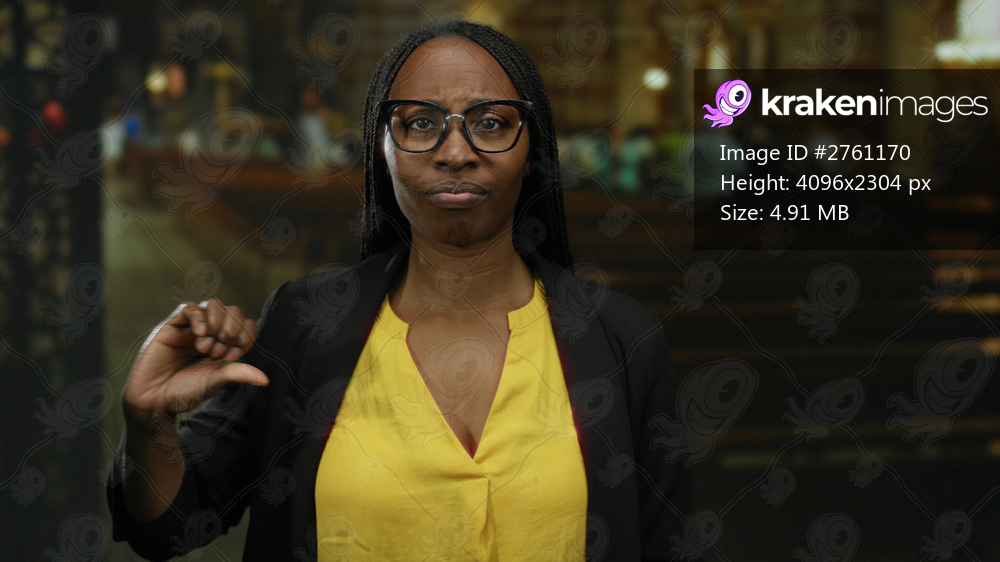 Woman in yellow shirt and glasses expressing emotion on urban street with people in background.