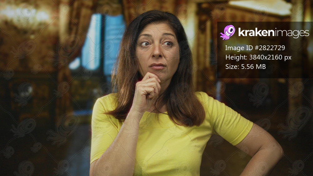 Woman in yellow shirt with hand on chin inside hotel building with draped curtains and warm lighting; uncertainty introspection curiosity.