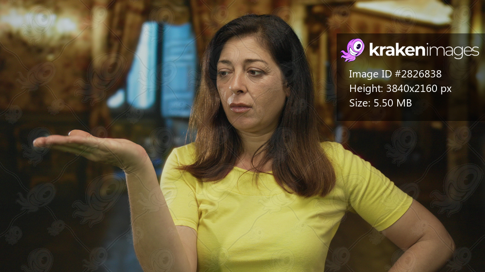 Woman in yellow shirt with hand on chin inside hotel building with draped curtains and warm lighting; uncertainty introspection curiosity.