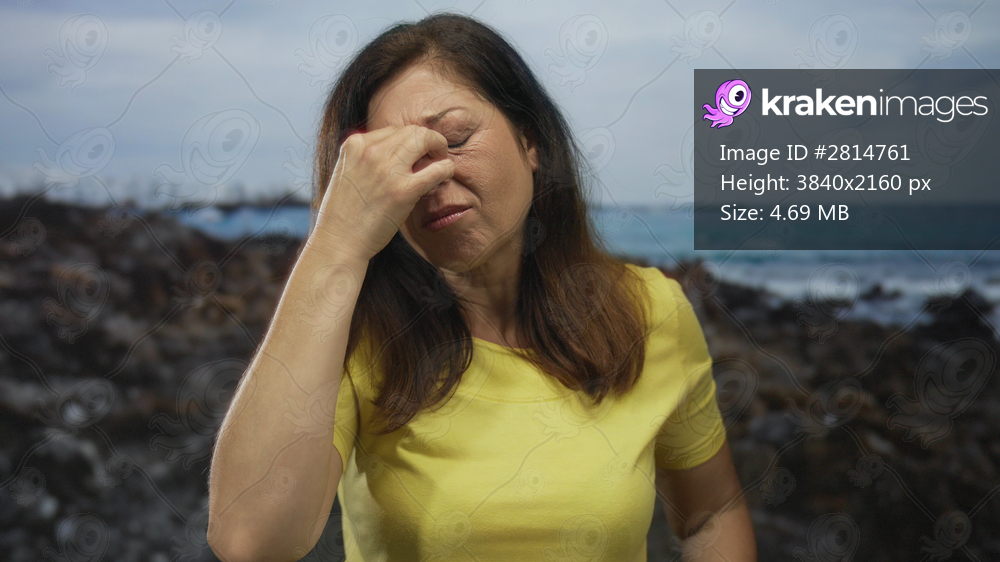 Woman in yellow shirt holding her forehead with both hands against rocky shoreline in studio; headache stress.