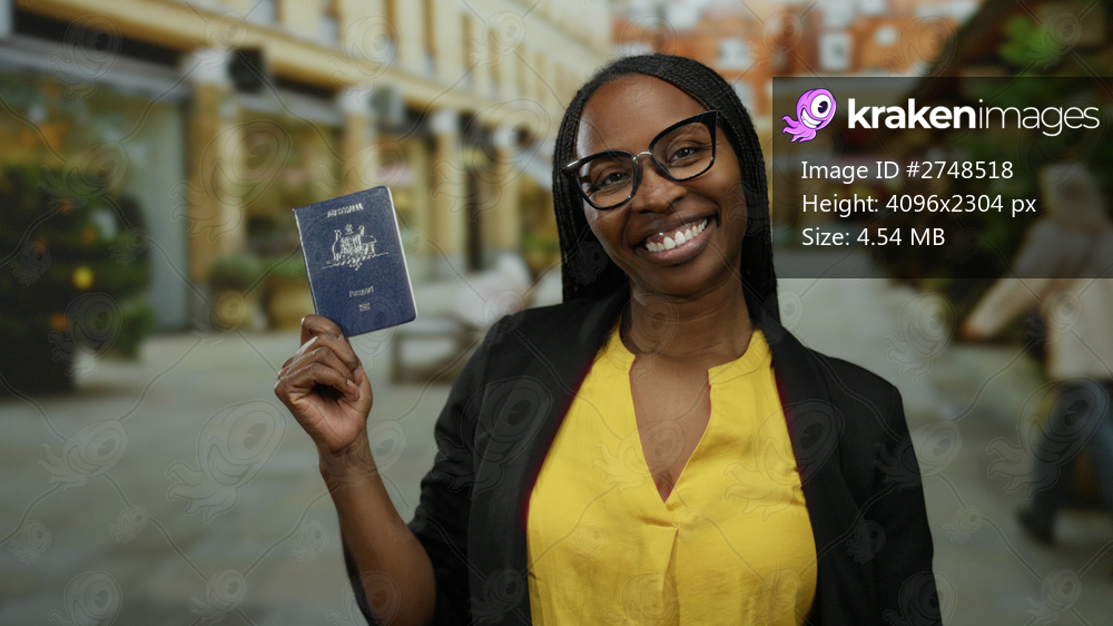 Woman in yellow shirt holds australian passport smiling on urban street, representing travel happiness and cultural diversity in an outdoor city setting. - Kraken Images