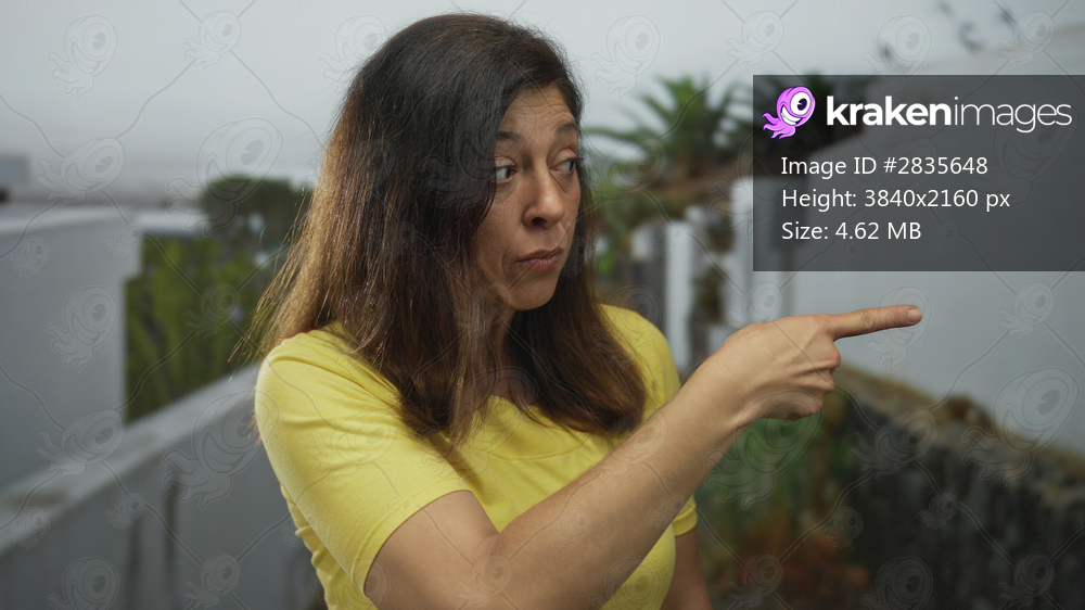 Woman in yellow shirt points index finger sharply along a white building wall outdoors on a balcony walkway to guide focus; command.