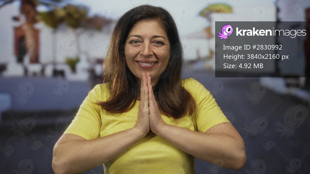 Woman in yellow shirt presses bare hands together at chest in sunlit street with blurred white buildings; serenity.