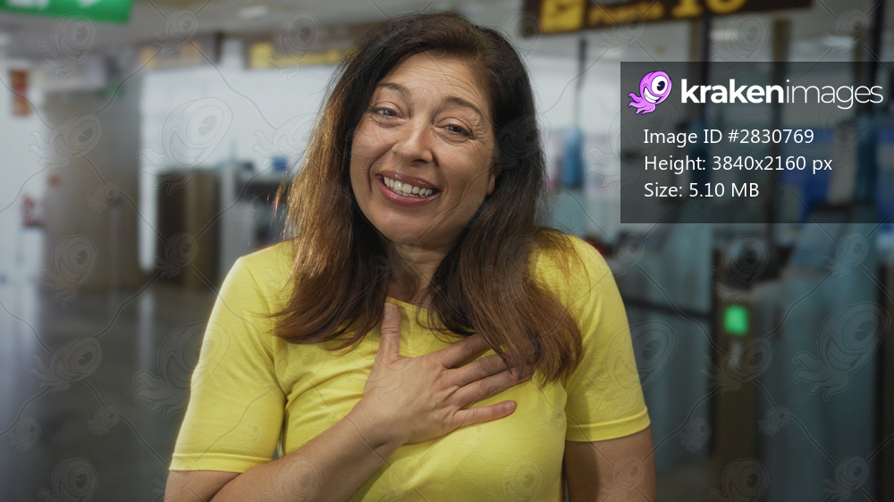 Woman in yellow shirt standing at checkin kiosk smiling with hand on chest in airport terminal; gratitude.