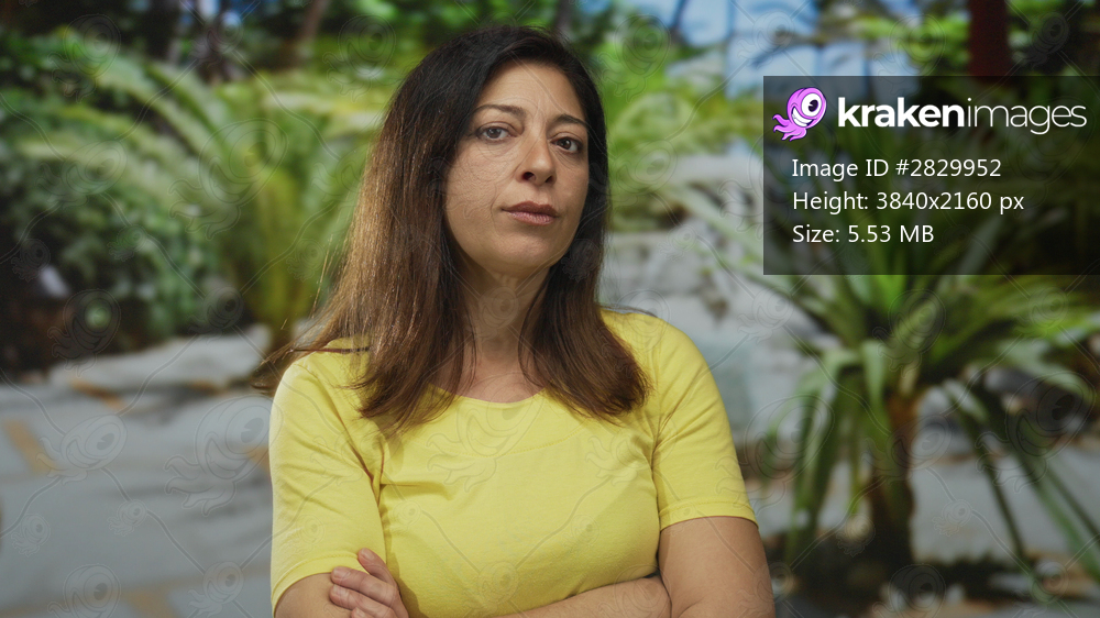 Woman in yellow shirt stands with arms crossed in forest walkway among lush green foliage; rejection.