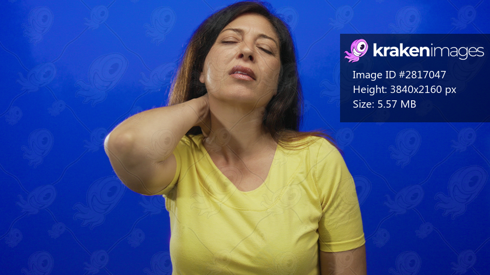 Woman in yellow shirt touching her neck with closed eyes showing tension in blue studio; discomfort.