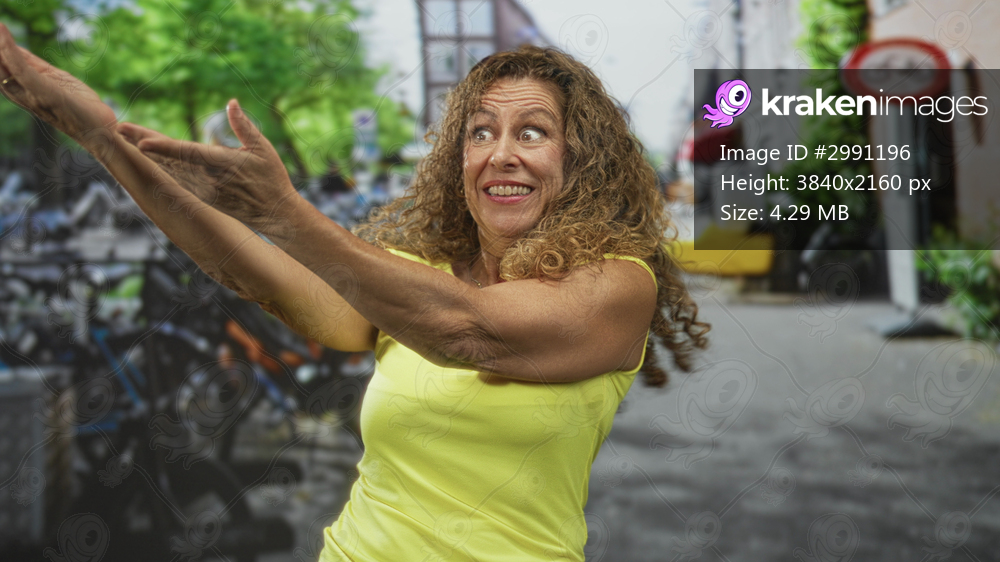 Woman in yellow sleeveless top waving hand on street with bicycles, sidewalk, trees and shop sign; joyful spontaneity.