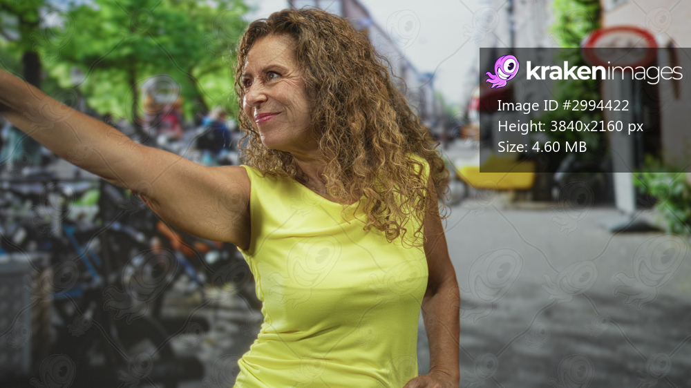 Woman in yellow sleeveless top waving hand on street with bicycles, sidewalk, trees and shop sign; joyful spontaneity.