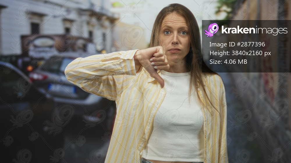 Woman in yellow striped shirt giving thumbs down gesture on a narrow city street with parked cars and graffiti walls; disapproval.