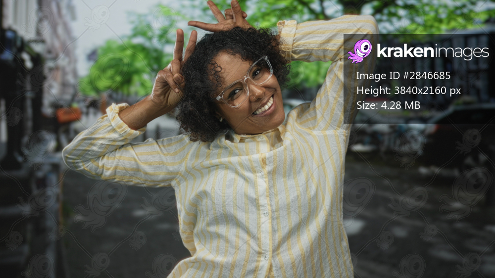 Woman in yellow striped shirt holds hands in bunny ears on city street lined with parked cars and leafy trees; carefree joy.
