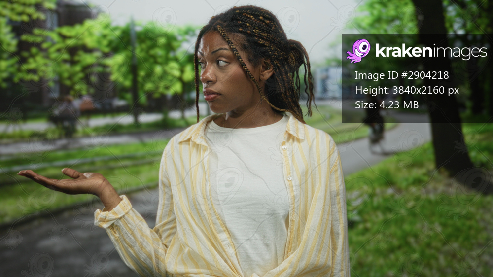 Woman in yellow striped shirt holds palm up on street beside leafy park path, looking to the side with a raised hand; quiet skepticism.