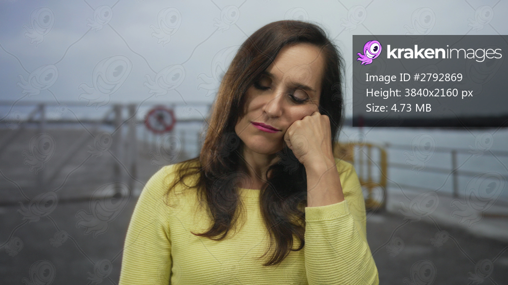 Woman in yellow sweater at seaside promenade looking pensive with eyes closed against a cloudy sky
