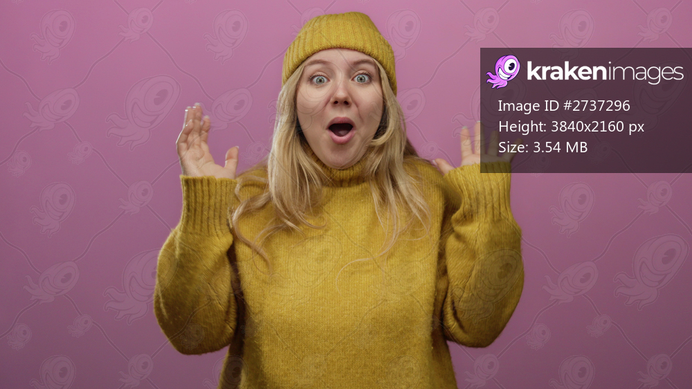 Woman in yellow sweater and beanie poses expressively against a pink background evoking surprise and curiosity, emphasizing her stylish casual winter look. - Kraken Images