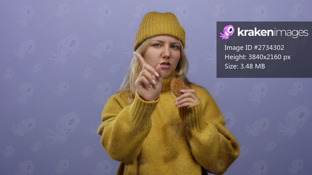 Woman in yellow sweater with cookie gestures no against purple wall