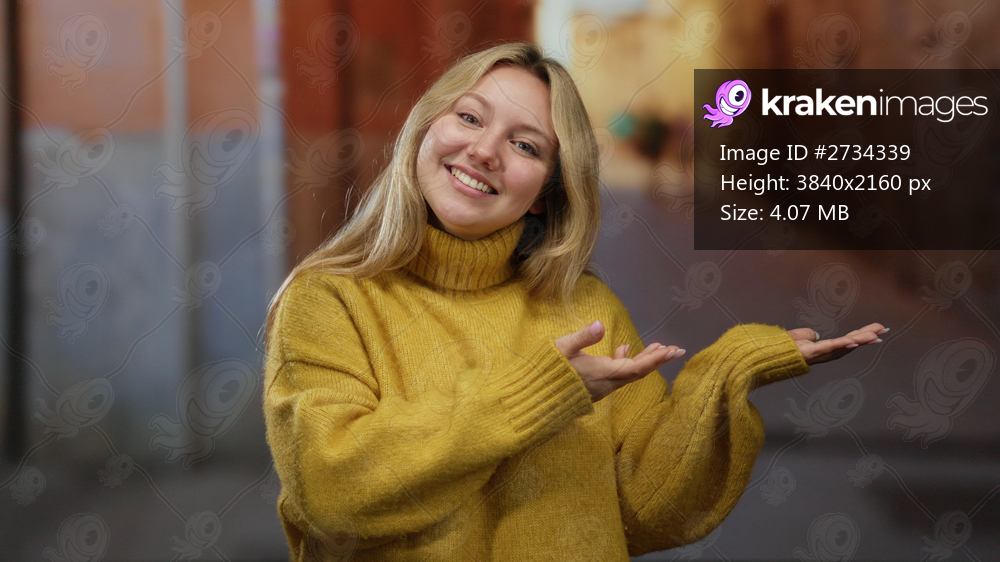 Woman in yellow sweater extends hands joyfully on a city street, showcasing a vibrant urban scene during daylight, expressing happiness and positivity in an outdoor environment. - Kraken Images