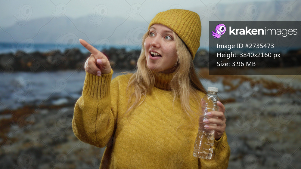 Woman in yellow sweater and hat holds bottle while pointing at the seaside with a joyful expression, standing against a beach landscape, capturing a relaxed outdoor moment. - Kraken Images