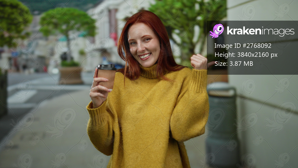 Woman in yellow sweater holding coffee cup on a city street smiling casually while standing outdoors with trees in the background during daytime.