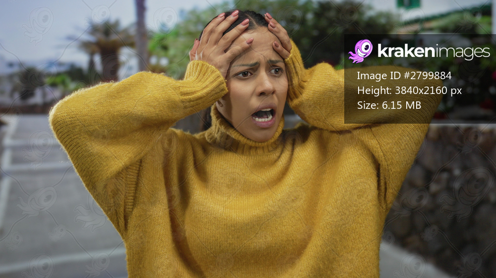 Woman in yellow sweater looking concerned in an outdoor urban setting expresses strong emotions on a street lined with plants and stone walls during daytime. - Kraken Images
