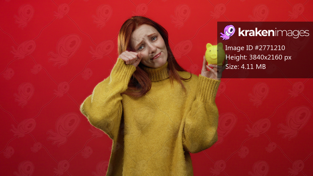 Woman in yellow sweater mimicking crying gesture while holding a yellow piggy bank against a red wall background.