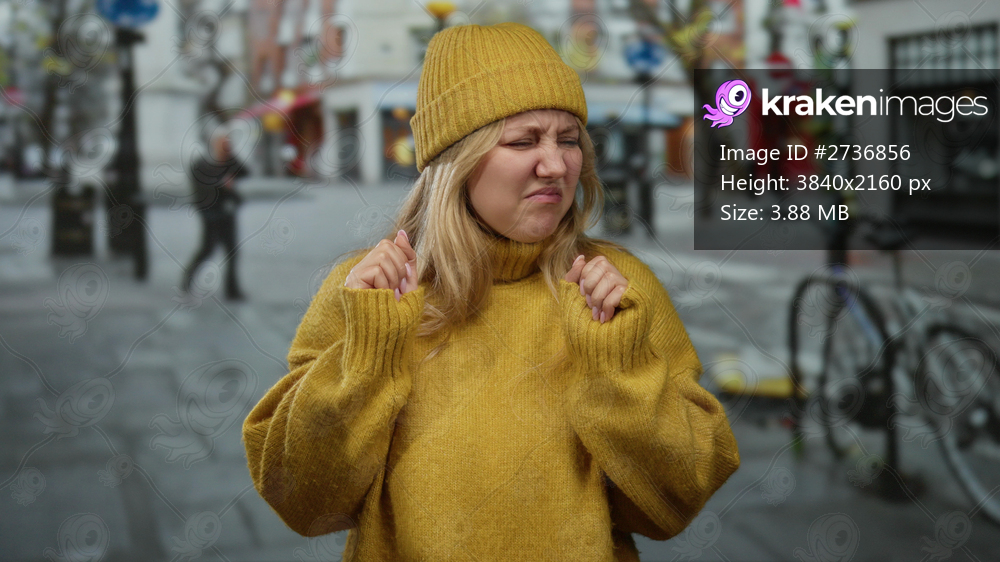 Woman in yellow sweater reacting with disgust outdoors on a city street with bicycles in the background.