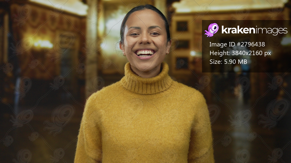 Woman in yellow sweater smiling indoors at a museum while making binoculars gesture in front of ornate walls showcasing youthful energy and cultural exploration. - Kraken Images