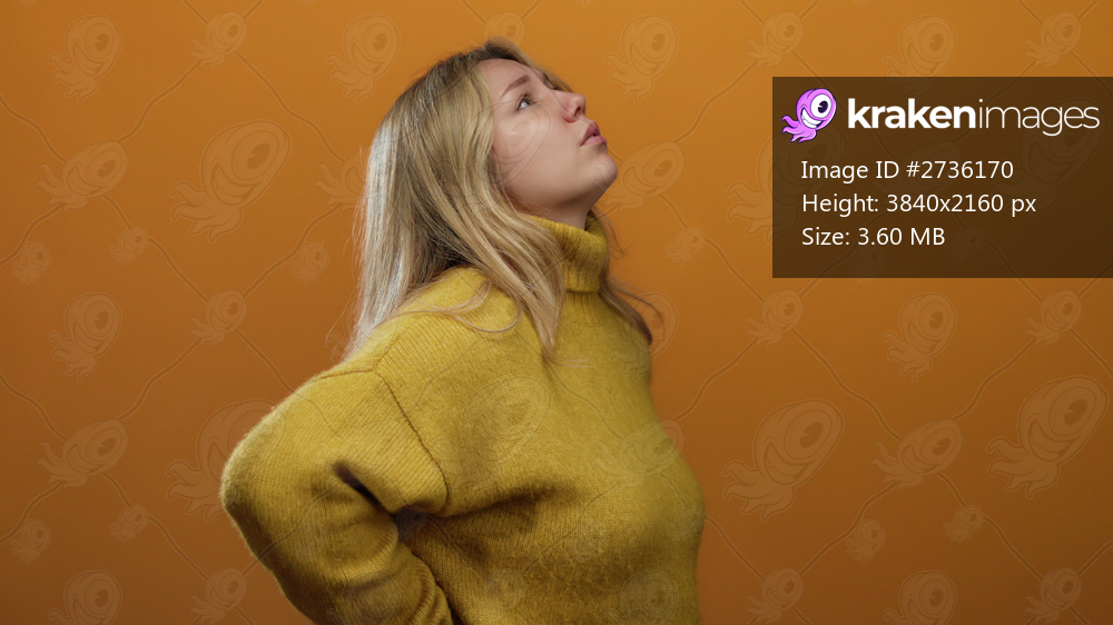 Woman in yellow sweater standing against orange background appears in pain touching her back with an expression of discomfort, suggestive of potential backache or tension. - Kraken Images