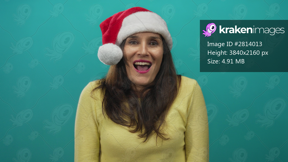 Woman in yellow sweater wearing christmas hat smiles excitedly against bright green wall, capturing festive joy and holiday spirit in an isolated setting. - Kraken Images