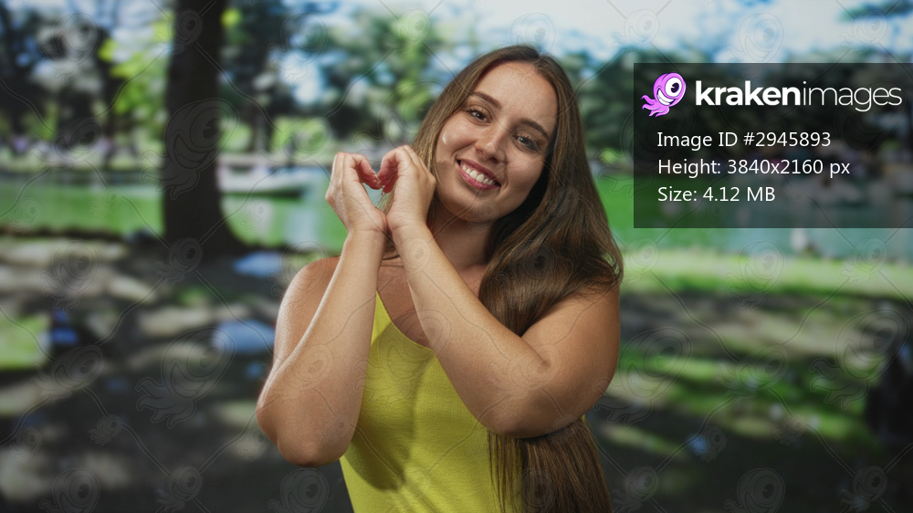 Woman in yellow tank top making a heart gesture with hands and smiling, bare shoulders visible near a lake in forest; joy love.