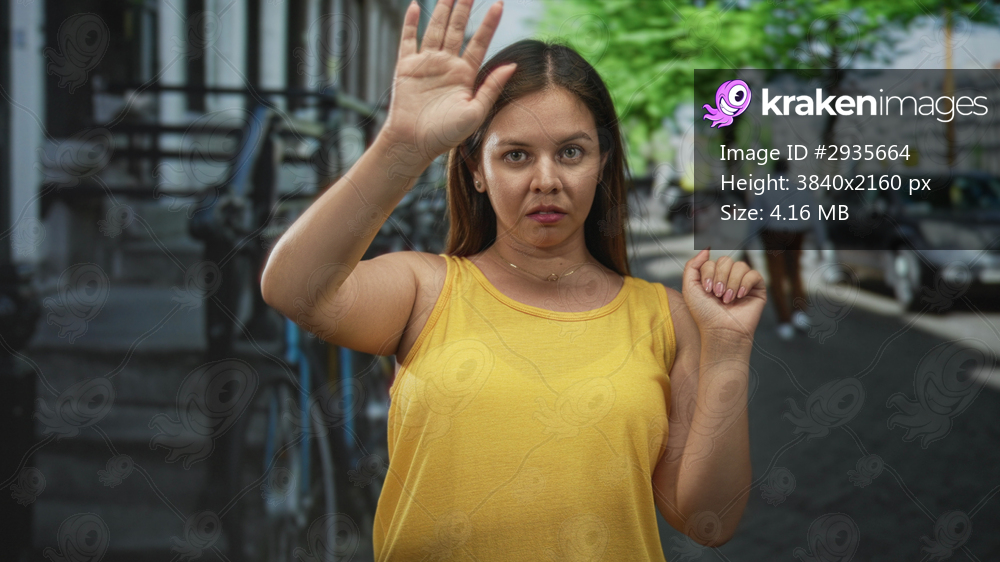 Woman in yellow tank top raising both hands with fingers pointed upward on a busy city street near parked cars and a bicycle rack; confidence.
