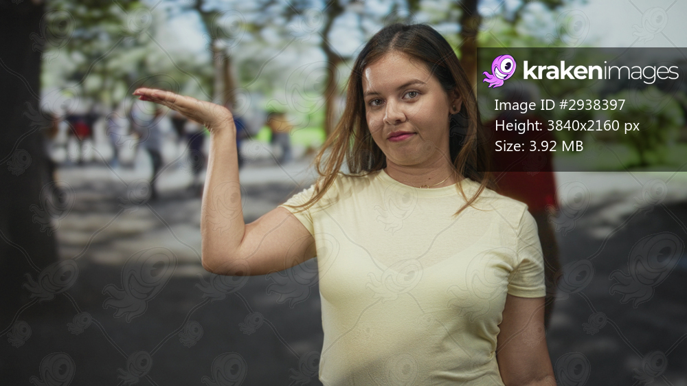 Woman in yellow tee holding palm up with eyes closed and slight smirk while standing near trees on park pathway; dismissal gesture.