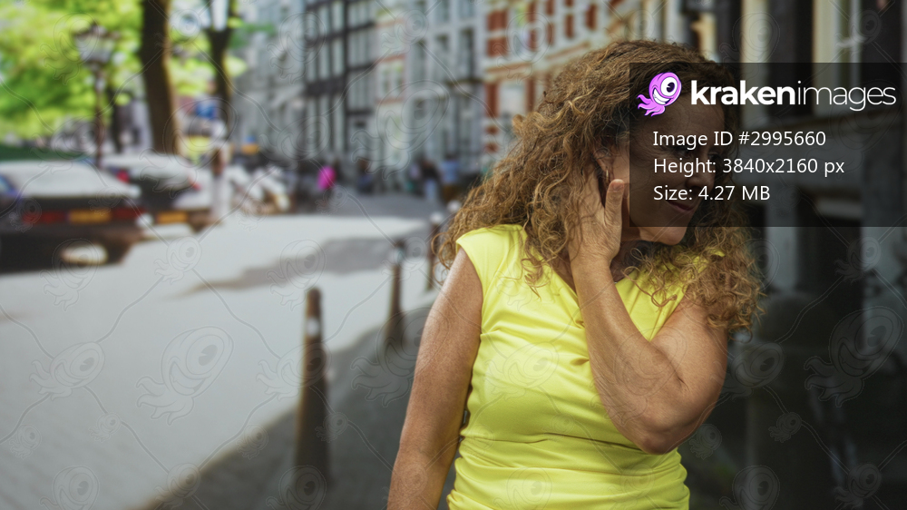Woman in yellow top hand to forehead for headache on city street beside bollards and parked car; fatigue reflection.