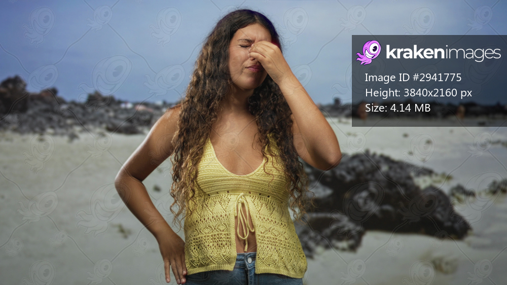 Woman in yellow top with long curly hair pinches nose, rubs temples and brushes hair with hands in studio beach backdrop; discomfort.