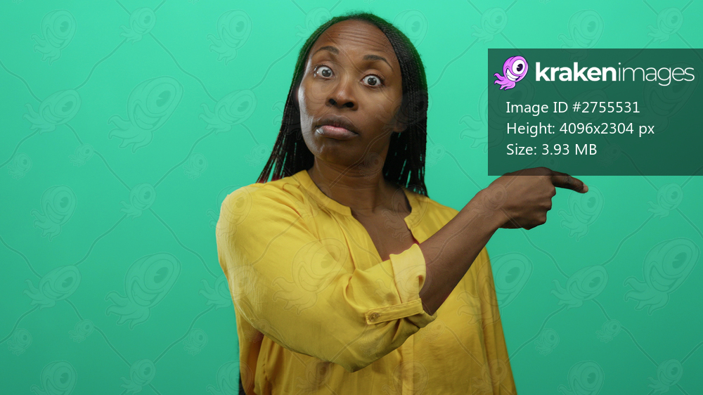 Woman in yellow top with long hair pointing against a green background looking confident and expressive standing in front of an isolated backdrop.
