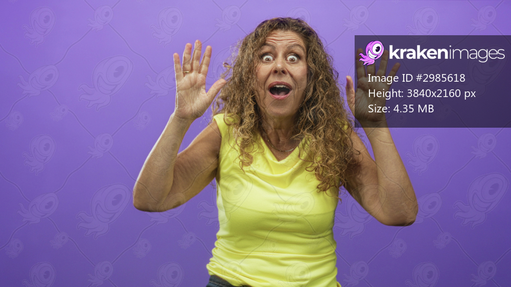 Woman in yellow top pulls at her eyes and raises hands in a studio with purple backdrop; surprise expression.