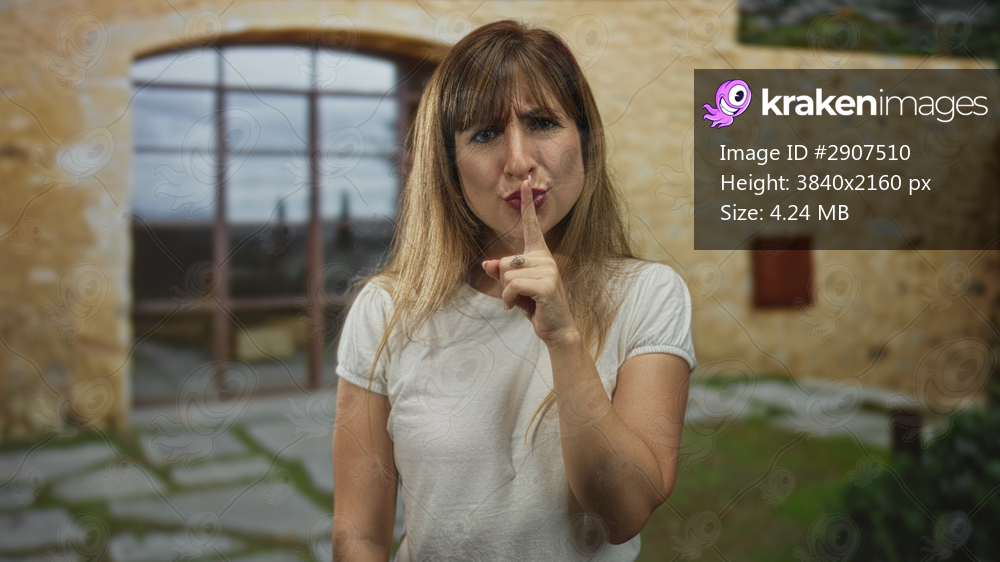 Woman with index finger to lips for silence at house entrance outdoors by stone doorway; silence secrecy calm.