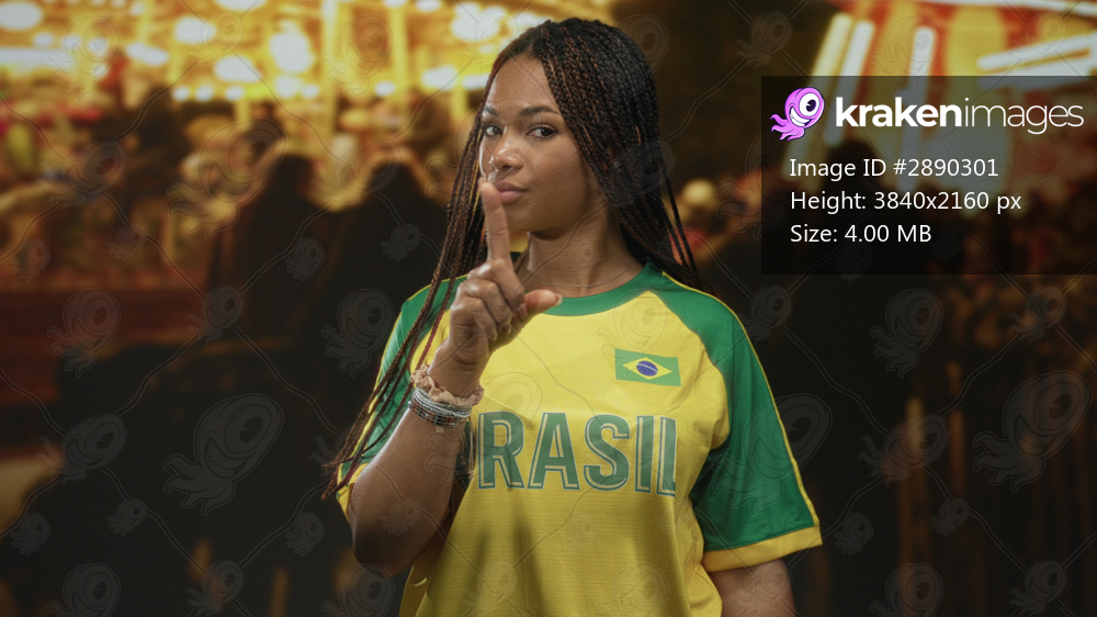 Woman with index finger to lips for silence in a street fair at night wearing brazil soccer shirt; quiet confidence.