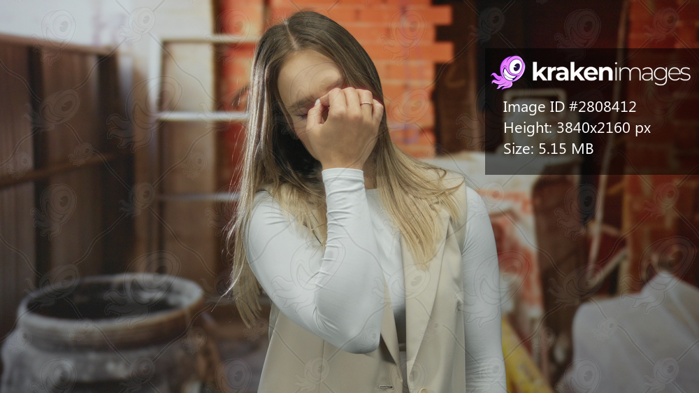 Woman indoors at construction site appearing worried with blonde hair wearing white top and beige vest surrounded by industrial equipment and unfinished walls displaying concern. - Kraken Images