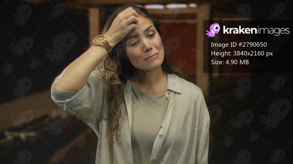 Woman indoors at construction site expressing thoughtfulness while adjusting hair against dimly lit background, reflecting on work challenges.