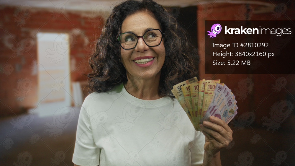 Woman indoors at construction site holding mexican pesos and making a shushing gesture, emphasizing secrecy, middle-aged, hispanic, cash, finance, business, glasses, smile. - Kraken Images