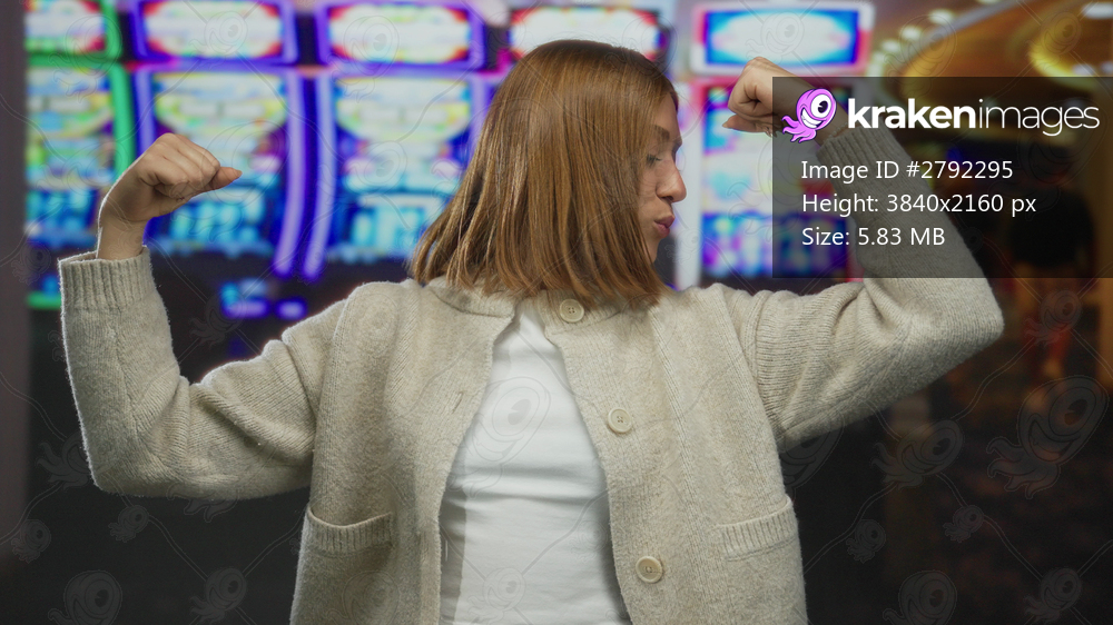 Woman indoors celebrating near colorful casino slot machine excitedly flexing arms showcasing victory achievement.