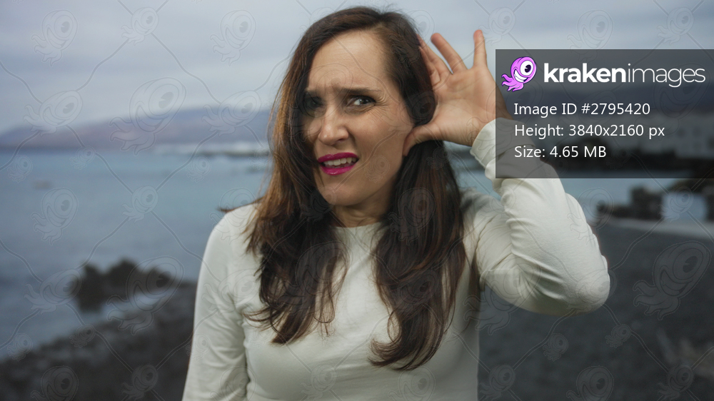 Woman indoors conveying confusion by the seaside promenade featuring a young hispanic woman exhibiting long hair against an outdoor backdrop of the ocean and cloudy skies. - Kraken Images