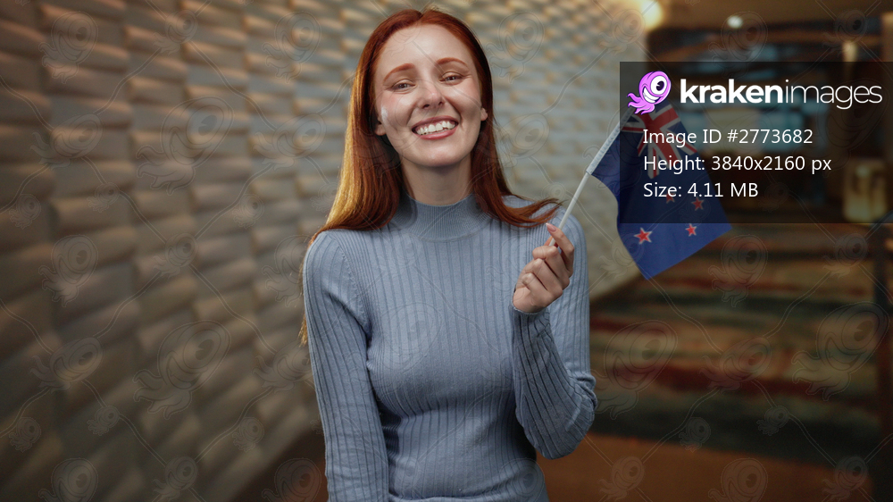 Woman indoors holding new zealand flag in hotel lobby smiling with red hair wearing blue sweater showing happiness and patriotism.