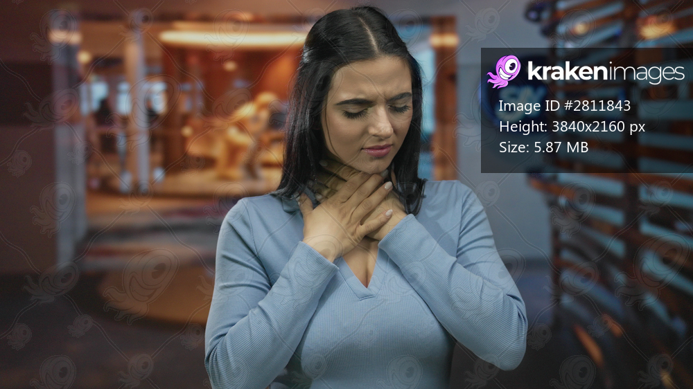 Woman indoors in hotel expressing discomfort and coughing with focus on throat, wearing blue top, set against an indoor setting, captures a candid health concern moment. - Kraken Images