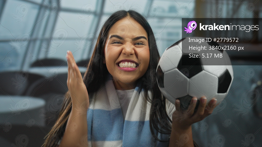Woman indoors with soccer ball, expressing excitement in a restaurant setting, capturing the essence of sports and youthfulness.